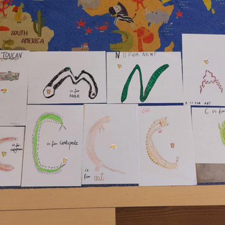 Pierwszym zagadnieniem zrealizowanym w ramach naszej innowacji były zabawy i zadania z książką "Animal ABC". Poznaliśmy zwierzęcy alfabet oraz literowaliśmy nazwy zwierząt. Powstały kreatywne prace