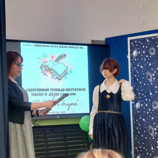 Dwie uczennice naszej szkoły: Anna Jaśkowiak (klasa 7) oraz Anna Muraszewska (klasa 4) wzięły udział w Międzyszkolnym Przeglądzie Recytatorskim Wierszy w Jezyku Angielskim "It's time to rhyme", który odbył się 20 kwietnia w siedzibie Szkoły Podstawowej nr 11 w Zgierzu. Uczennice recytowały wiersze: "Please don't read this poem" oraz "My mom's spaghetti". Zaprezentowały umiejętność posługiwania się językiem angielskim na wysokim poziomie, a także swoje zdolności aktorskie, piękną dykcję i wrażliwość na poezję. Dziewczyny zdobyły wysokie uznanie jury oraz otrzymały dyplomy i nagrody.