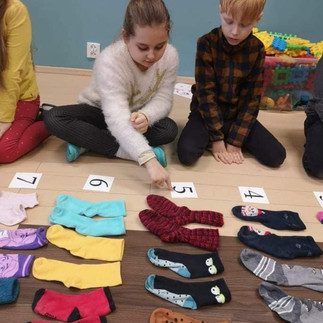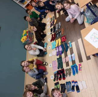 Uczniowie klasy 1A uczyli się dziś matematyki przy pomocy... SKARPETEK! Zbudowaliśmy skarpetkową piramidę, która doskonale zobrazowała nam czym są liczby parzyste i nieparzyste. Przy okazji uczyliśmy się też liczyć dwójkami, a nawet zrobiliśmy wstęp do mnożenia! Wszystko na kolorowych skarpetkach przyniesionych z domu! A skoro była już mowa o tych bez pary, nie mogliśmy nie zahaczyć tematycznie o lekturę "Niesamowite przygody dziesięciu skarpetek", którą zaczęliśmy wspólnie czytać. To był bardzo udany dzień, a więcej zabawy ze skarpetkami wkrótce:))